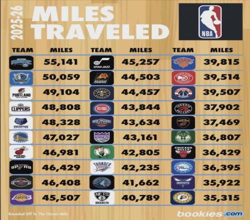 新赛季球队NBA飞行里程排行榜